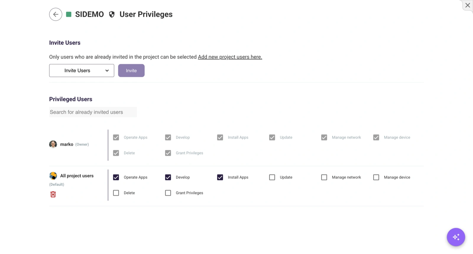 - Project owner — Automatically has full control over all devices, groups, boards, and data backends within the project. No separate per-asset grants are needed.