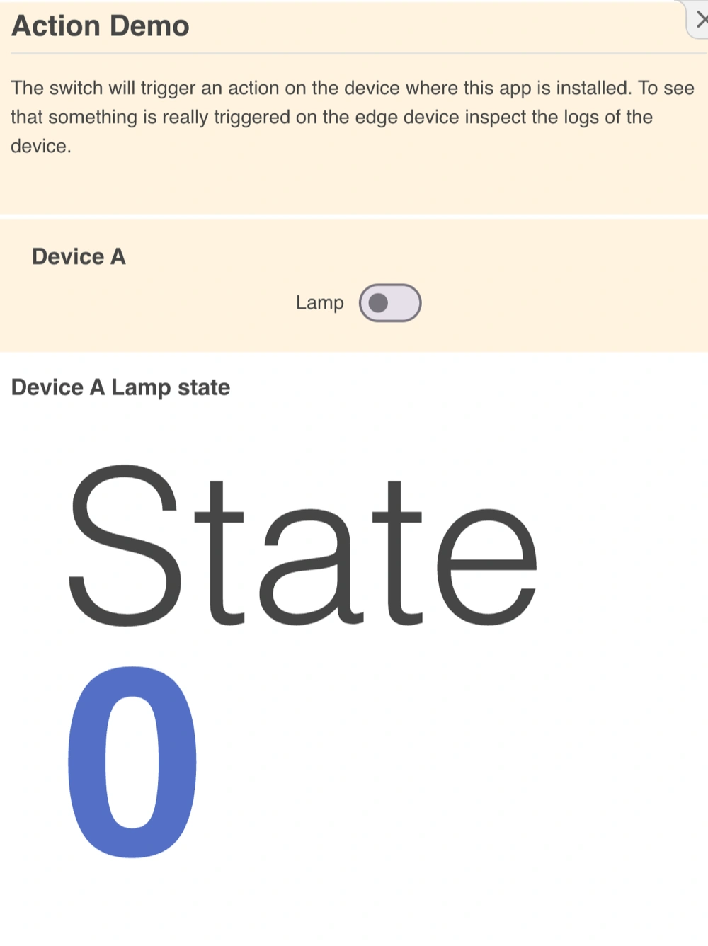Each app runs in its own message routing realm, keeping communication between apps isolated and secure. When you toggle an action widget, it publishes a message to the target app’s realm on the selected device. The edge component on that device receives the message and performs the physical action.