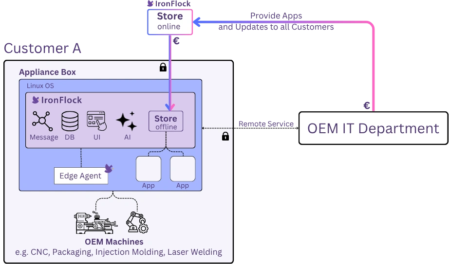 Consider a packaging machine manufacturer serving 50 factories worldwide. They develop a monitoring app in the IronFlock cloud IDE, release it to the App Store, and ship an Appliance with every machine. Each factory plugs in the Appliance, syncs the app once, and runs it locally — fully offline. When the manufacturer releases a predictive maintenance add-on six months later, each factory syncs the new app at their convenience and deploys it during their next scheduled downtime. Billing is handled automatically by IronFlock.